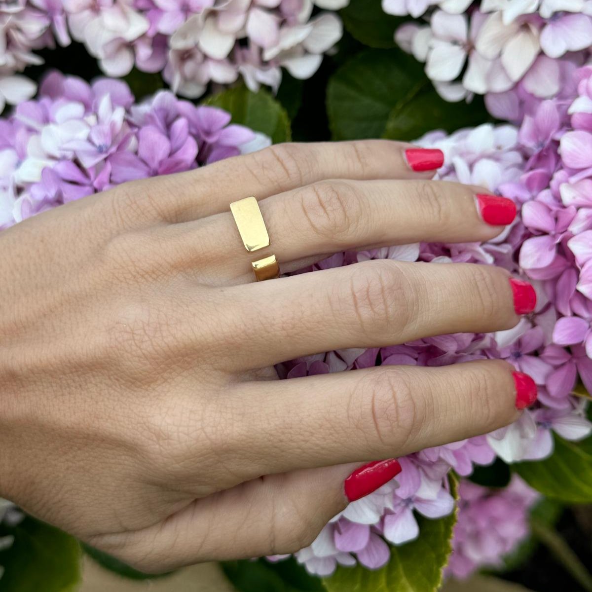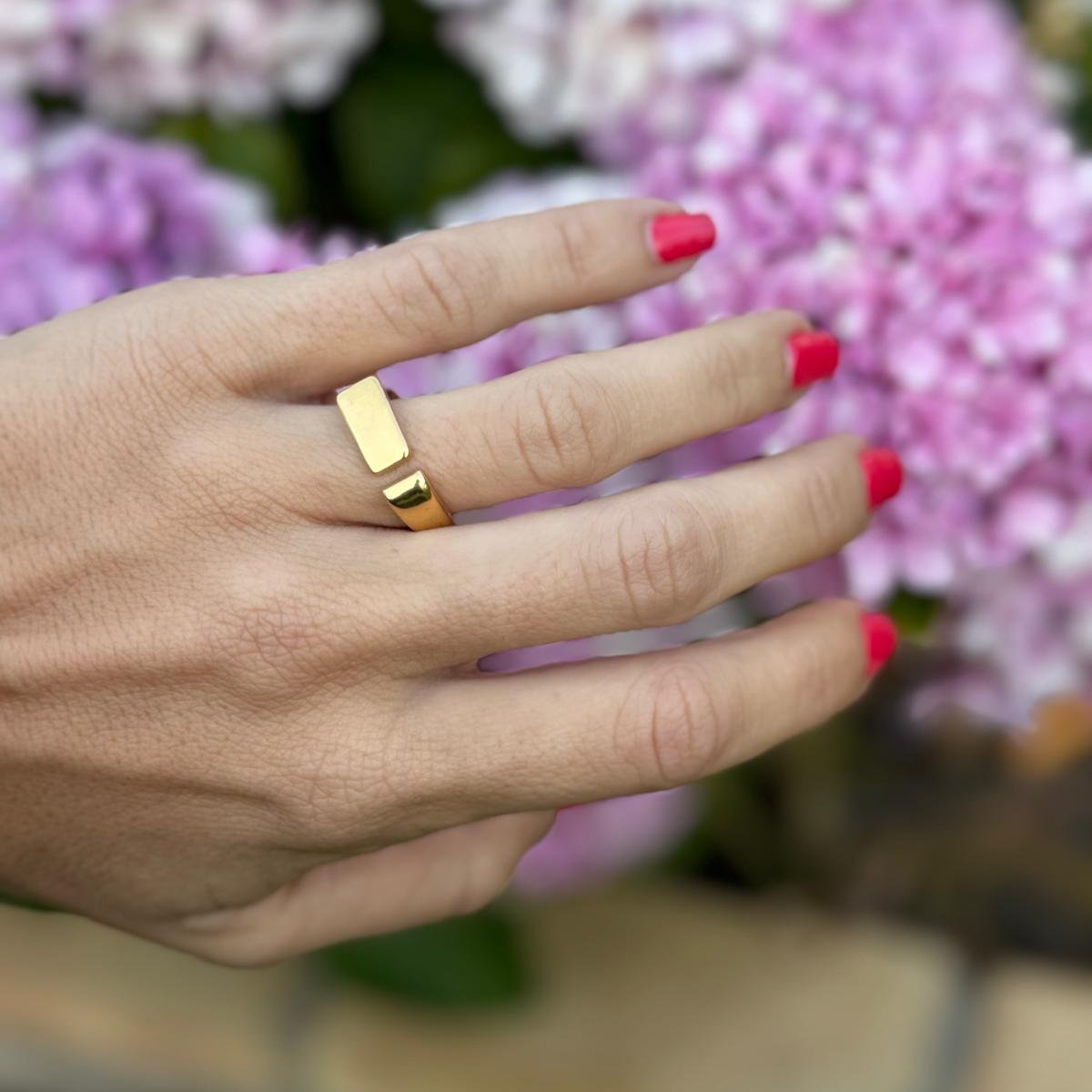 Anillo dorado de acero inoxidable con una apertura por delante y forma rectangular.