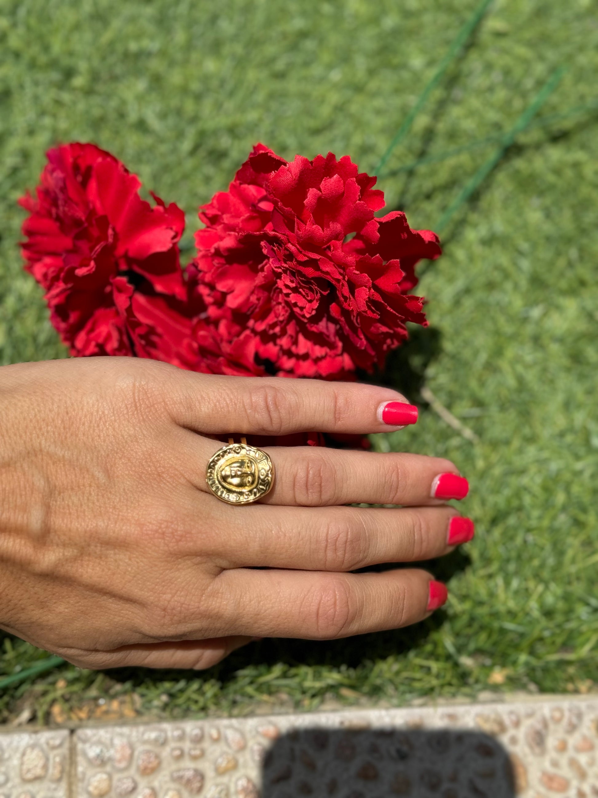Anillo de acero inoxidable dorado con el rostro de la Virgen del Rocío