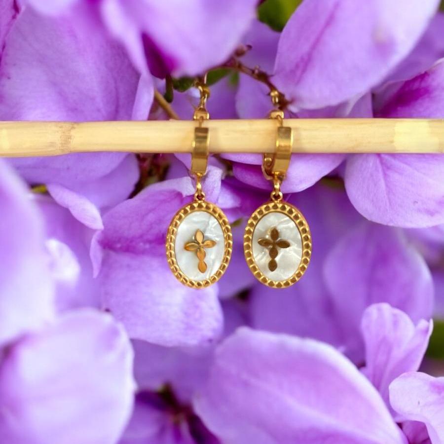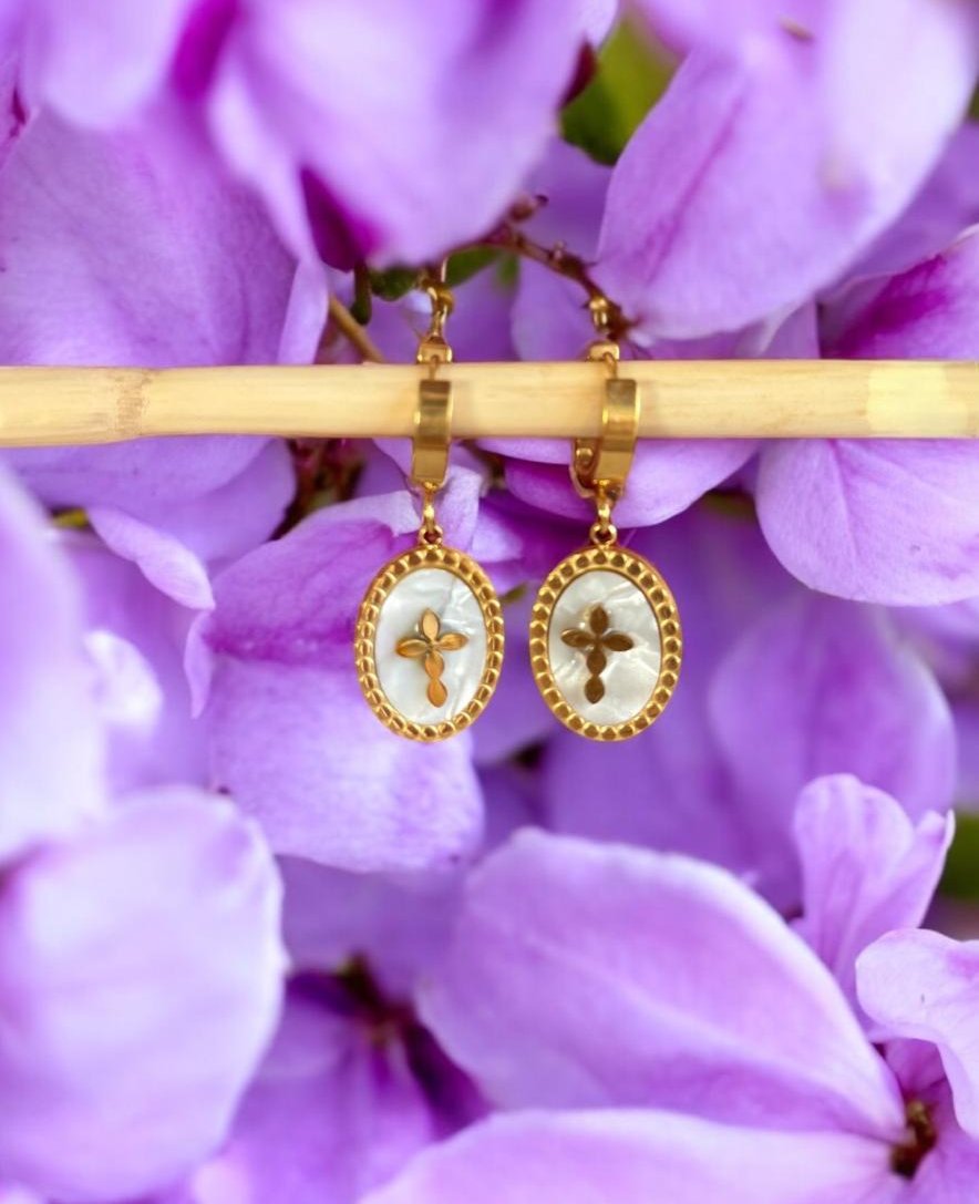 Mini aros dorados con colgante ovalo de nácar y una cruz dorada en el centro.