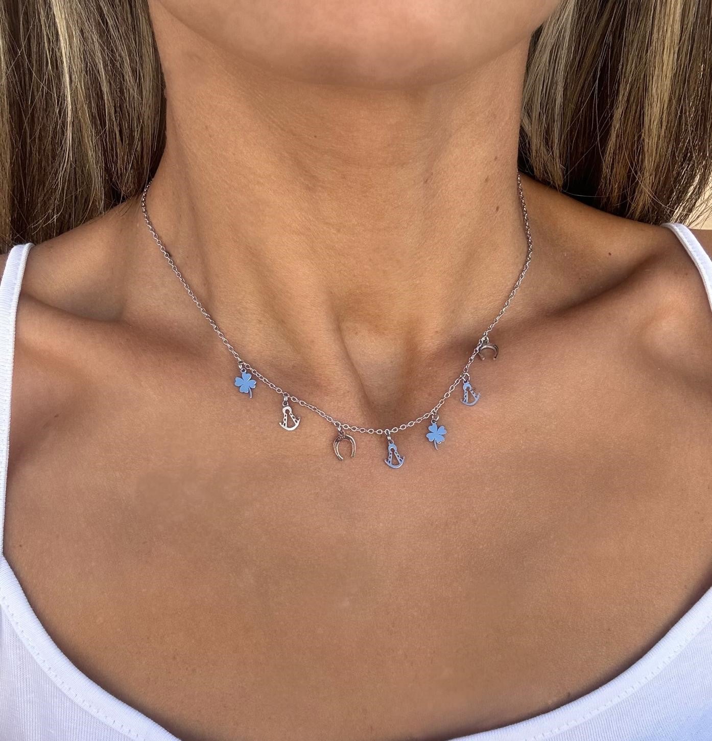 Collar con pequeños abalorios de la suerte y la silueta de la Virgen del Rocío.