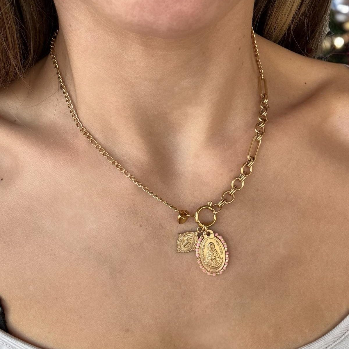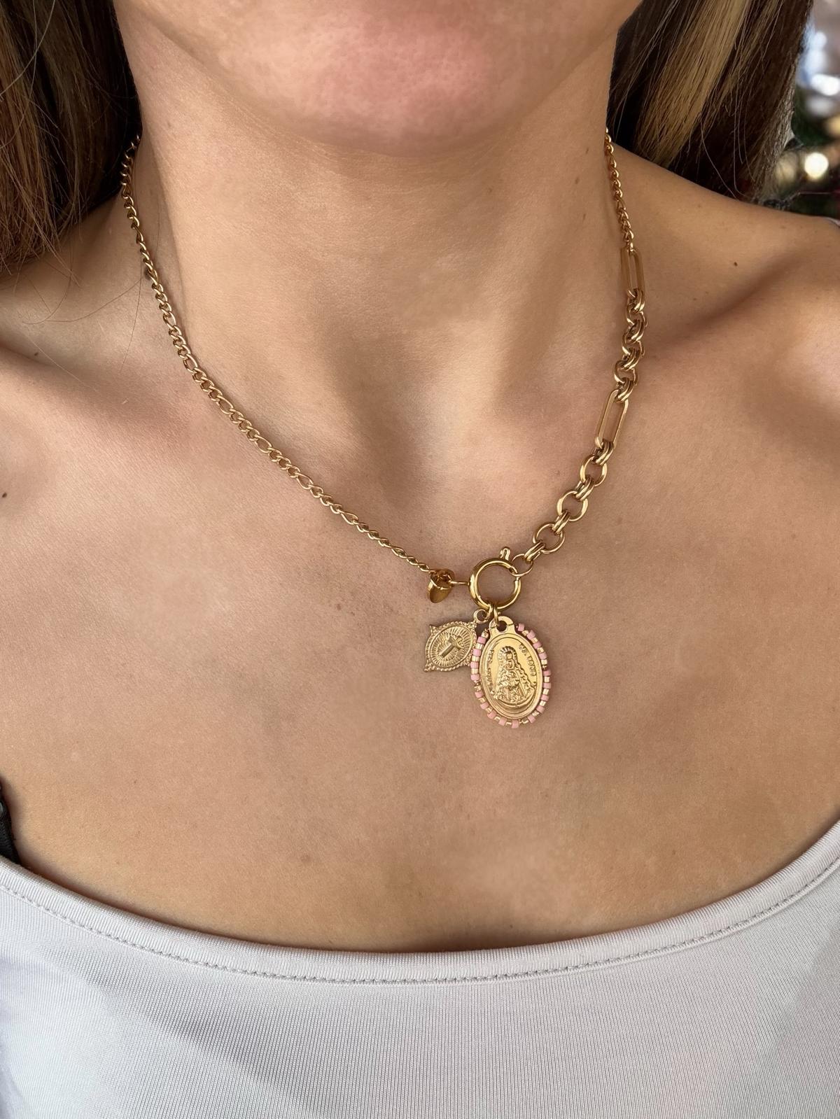 Collar dorado con colgante ovalado con perlitas alrededor de color rosa de la Virgen del Rocío y un colgante mas pequeño ovalado con una cruz.