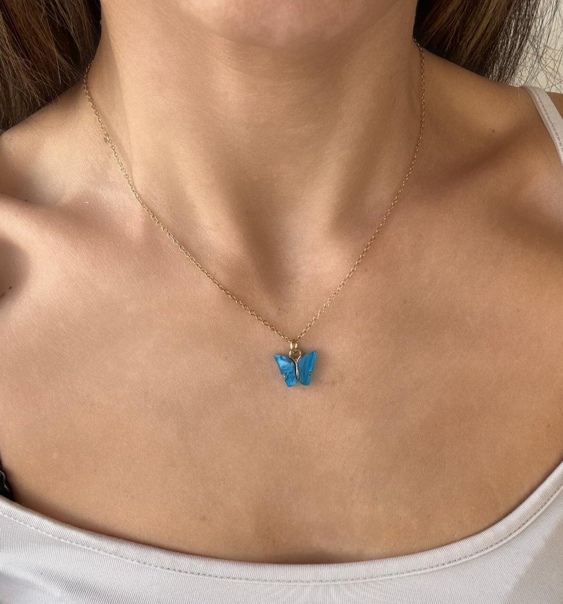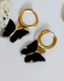 Pack compuesto por un colgante y mini aros de mariposas de color.