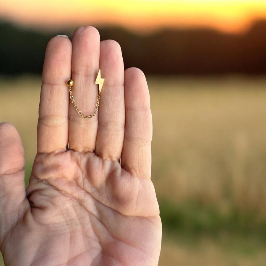 Par de pendientes dorados unidos por una cadenita. Perlita dorada y rayo.