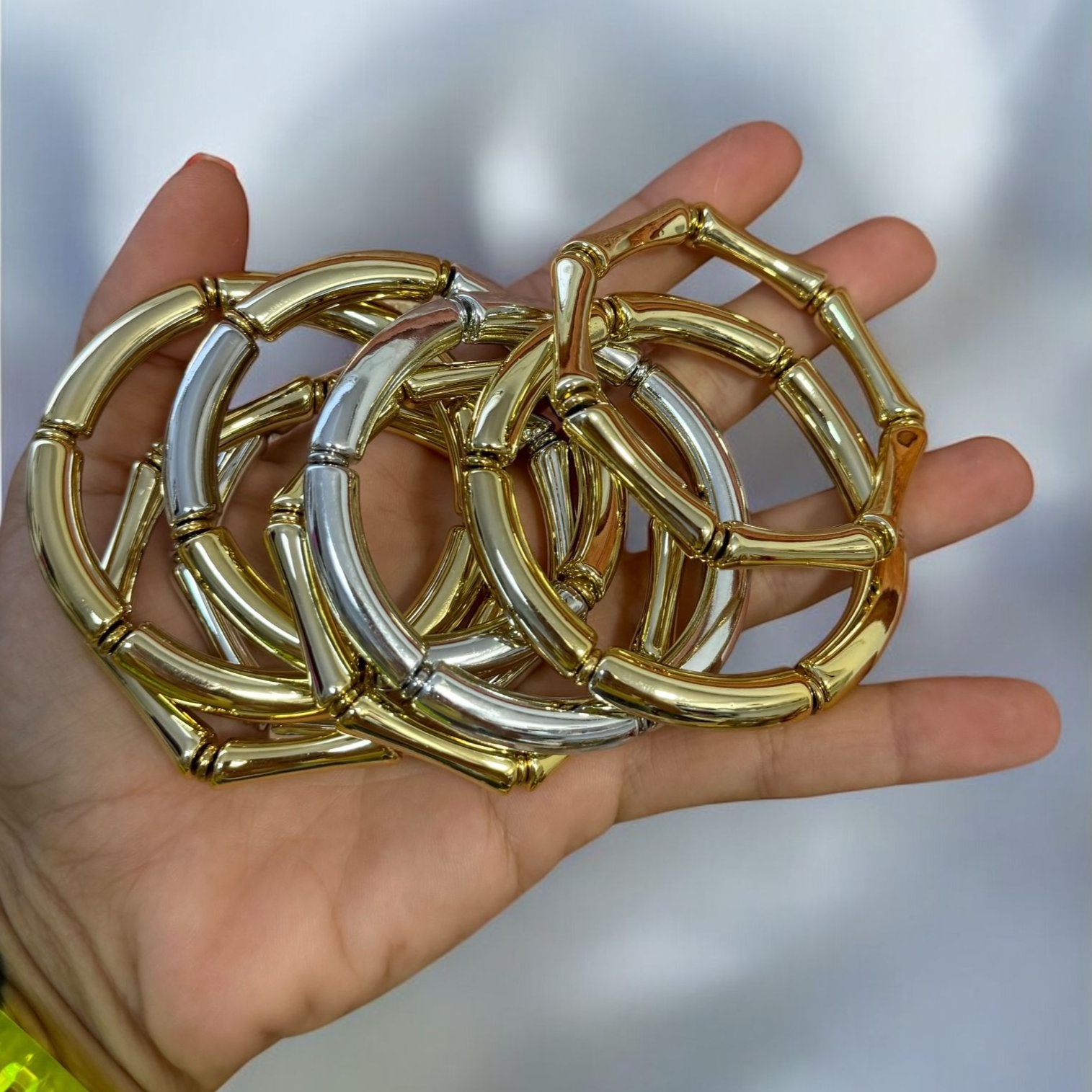 Pulseras acrílicas elasticas de color dorado y plateado.
