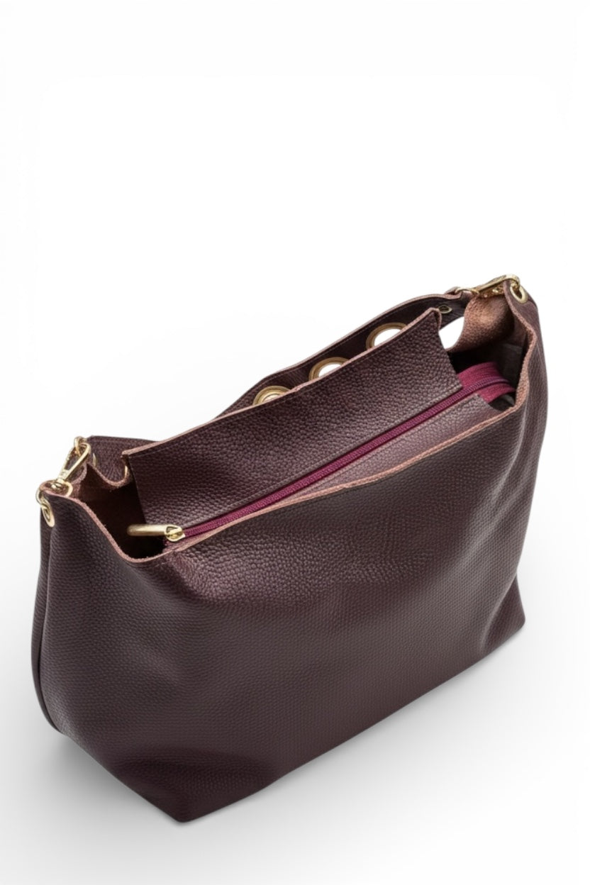 Descubre el SHOPPER PRAGA en color burdeos, un bolso de piel que combina elegancia y modernidad. Su asa de arandelas doradas no solo añade un toque de lujo, sino que también ofrece comodidad y estilo en cada uso. ¡Transforma tu look y siéntete espectacular en cualquier ocasión!